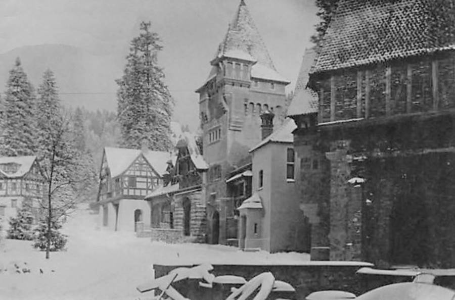 O fotografie rară surprinde zona Castelului Peleș acoperită de zăpadă, în anii interbelici. Clădirea impunătoare din prim-plan este Corpul de Gardă, ridicat între 1890–1893, după planurile arhitectului Karel Liman. Aici locuiau o parte dintre ofițerii care asigurau paza domeniului regal.