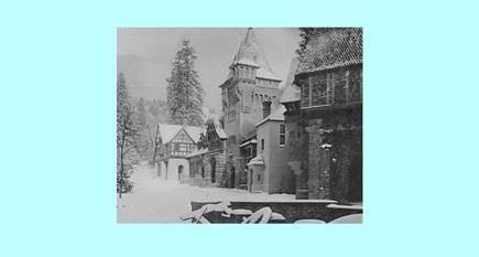 O fotografie rară surprinde zona Castelului Peleș acoperită de zăpadă, în anii interbelici. Clădirea impunătoare din prim-plan este Corpul de Gardă, ridicat între 1890–1893, după planurile arhitectului Karel Liman. Aici locuiau o parte dintre ofițerii care asigurau paza domeniului regal.