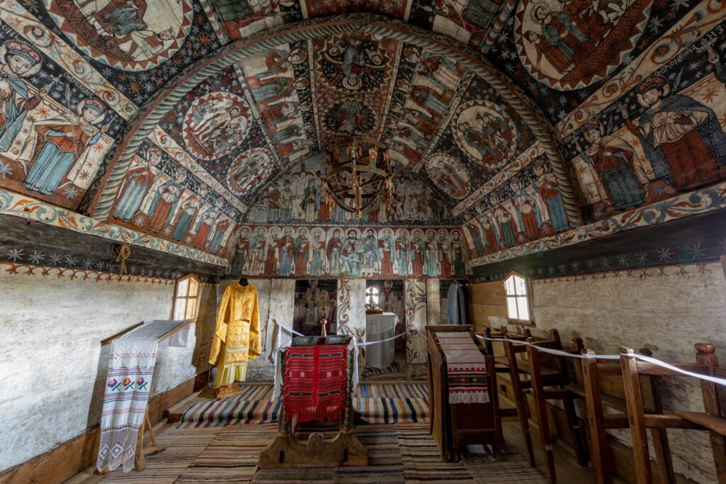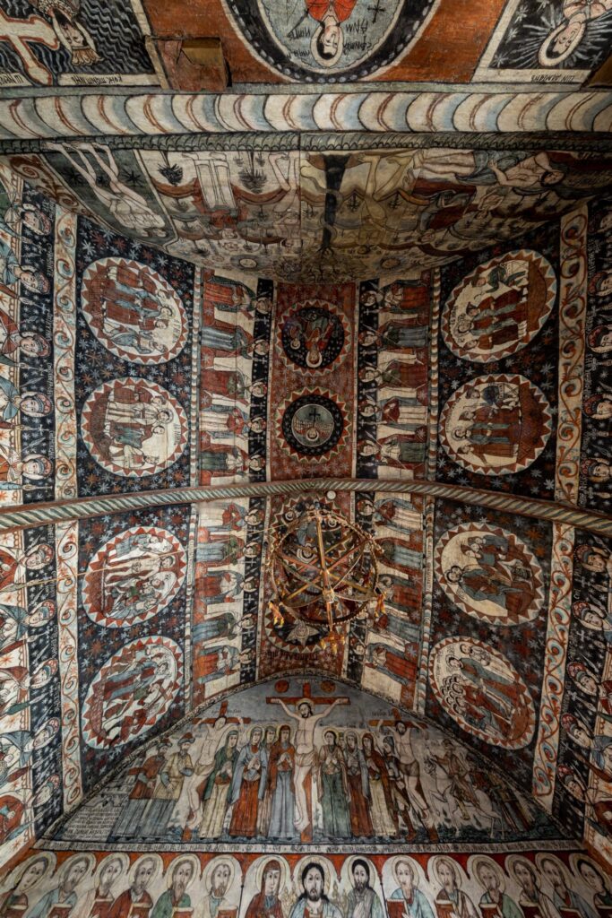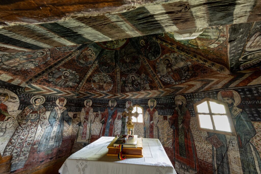 Oriunde ai sta, ochii de sfinți te urmăresc din înaltul bolții sau de pe pereți. Parcă sunt într-o neîntreruptă veghere asupra celor care de mai bine de 350 de ani caută liniște și speranță în mica biserică. „Țăranii nu știau carte și tocmai de aceea scenele biblice au un pronunțat caracter descriptiv. Vedem scene cu Facerea femeii din coasta lui Adam, apoi păcatul primordial, urmat de izgonirea lui Adam și a Evei din Rai. Așa, oamenii înțelegeau mai ușor Biblia.”